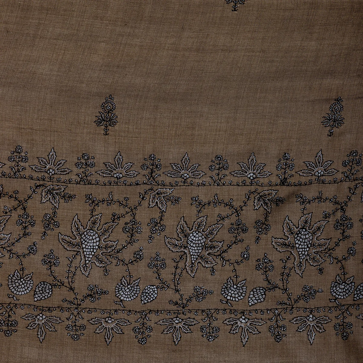 It features a subtle grey base, elegantly highlighted by white and darker, nature-inspired embroidery. The detailed floral and leaf patterns are symmetrically arranged, creating a sense of balance and beauty. This stole is perfect for those who appreciate the fine art of hand embroidery and the timeless appeal of Pashmina.