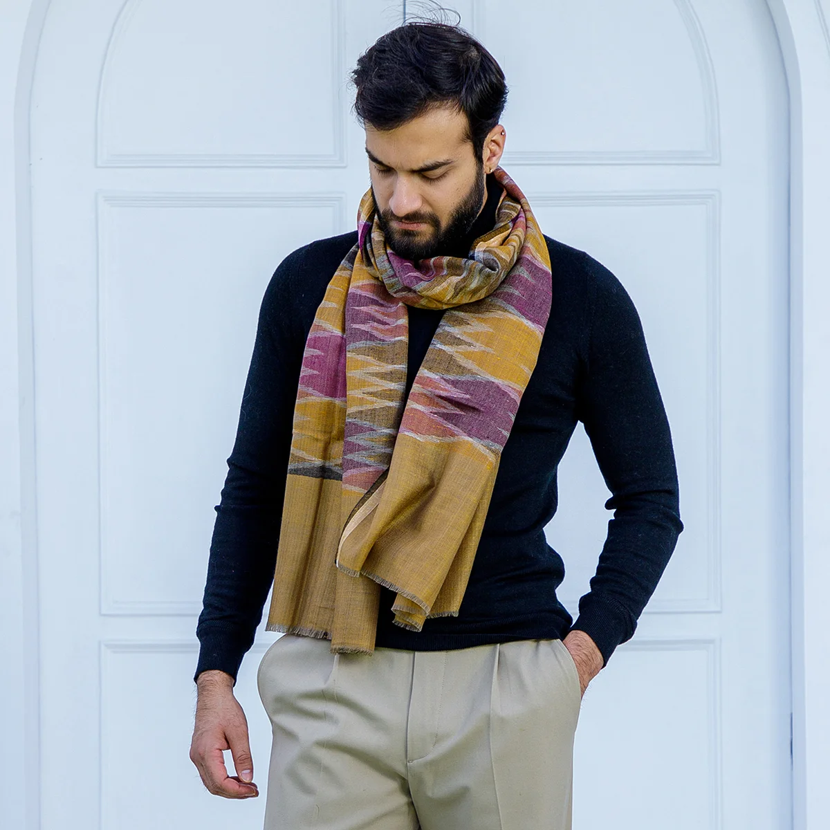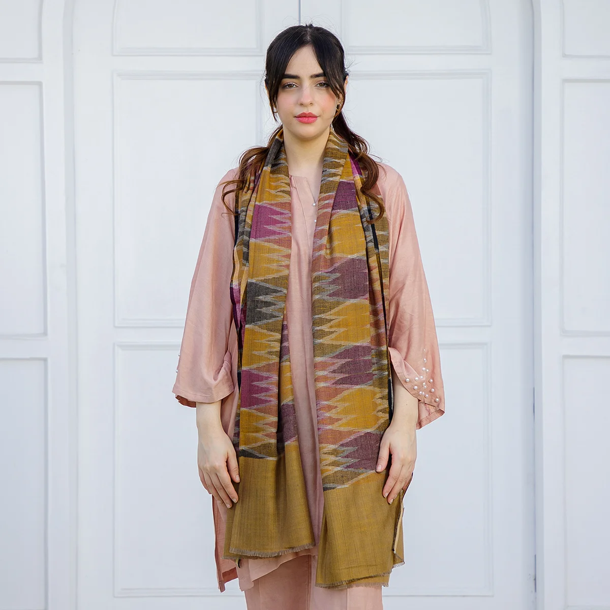 Creating a captivating visual feast for the senses. Expertly crafted with intricate Ikat weaving techniques, each thread tells a story of artisanal skill and timeless elegance. Finished with a classic plain dark brown border, this shawl exudes refined sophistication and effortless beauty. Wrap yourself in the radiant embrace and ignite your style with its luminous charm.
